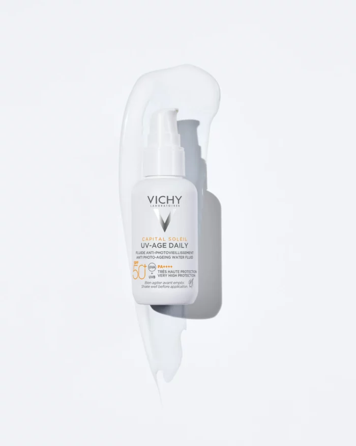 La crème solaire UV Age fluide quotidienne SPF50+ anti-âge convient à tous les types de peau. Elle assure une protection contre les rayons UVA et UVB, tout en prévenant les dommages causés par le soleil.