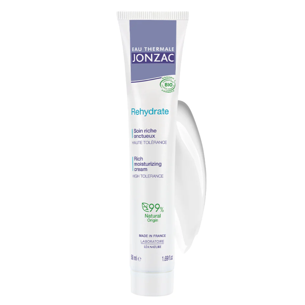 JONZAC REHYDRATE SOIN RICHE ONCTUEUX renforce le film hydrolipidique de la peau pour redonner souplesse et confort aux peaux normales à sèches. Enrichi en eau thermale de Jonzac, glycérine végétale et acide hyaluronique d’origine naturelle, le soin riche onctueux Rehydrate active immédiatement l’hydratation naturelle de la peau.