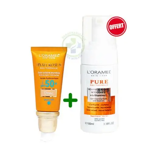 L’Oramel écran solaire SPF50+ teinté dune – 40ml + Mousse nettoyante Vitamine C – 100ml offerte