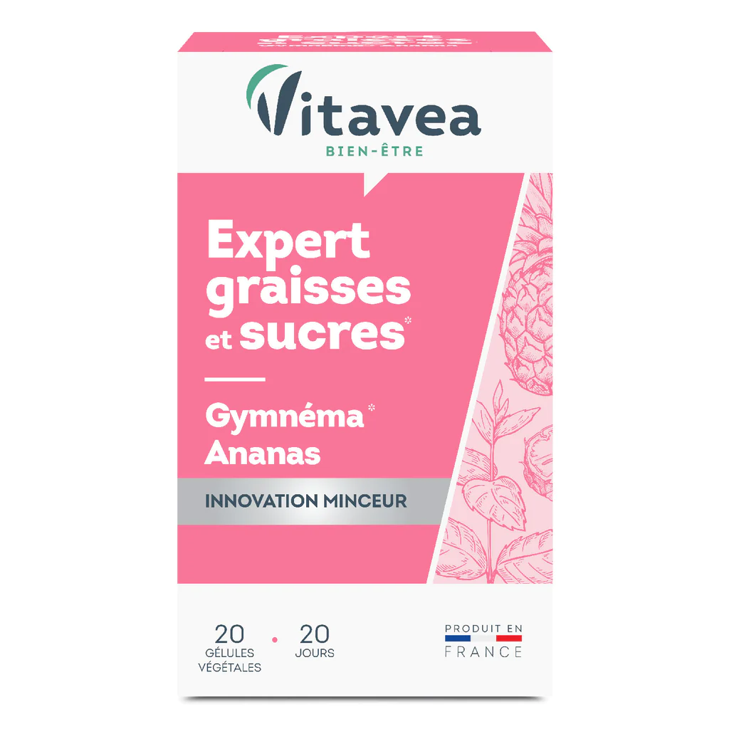 Vitavea Expert Graisses et Sucres est un complément alimentaire conçu pour aider à contrôler l’absorption des graisses et des sucres au quotidien. Sa formule unique contribue à limiter les excès et à favoriser un métabolisme normal. Ce produit est destiné aux personnes souhaitant maîtriser leur poids et adopter une alimentation équilibrée, en complément d’une activité physique régulière. Il est présenté sous forme de gélules, faciles à avaler et à intégrer dans votre mode de vie.